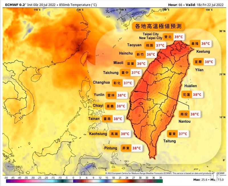 The nation’s highest temperatures tend to be recorded in areas that lack wind and foliage, such as the Taipei Basin, where temperatures are forecast to reach 40°C on Sunday or Monday, meteorologist Peng Chi-ming (彭啟明) said, adding that the urban heat-island effect could make Taipei and New Taipei City even hotter.