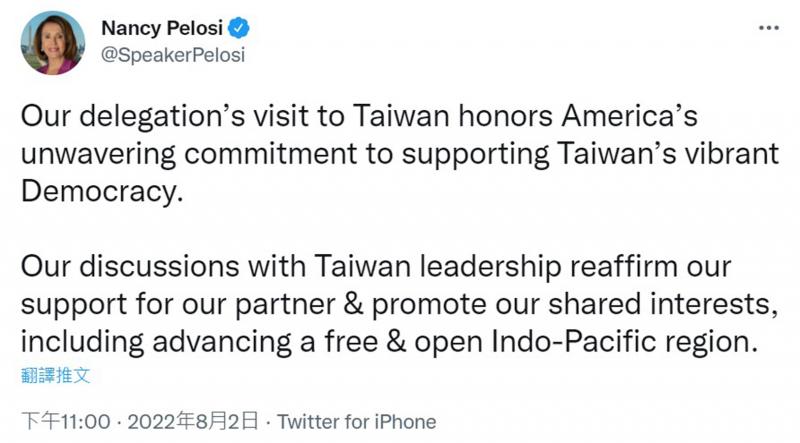 In a statement issued after her arrival, Pelosi said that her delegation’s visit "honors America’s unwavering commitment to supporting Taiwan’s vibrant Democracy."