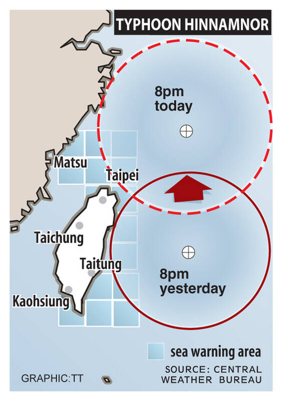 Typhoon Hinnamnor yesterday brought heavy rains and strong winds to New Taipei City, Yilan County and Keelung after the Central Weather Bureau issued a land warning in the morning, saying that the storm was expected to pass near Taiwan’s northeast coast.