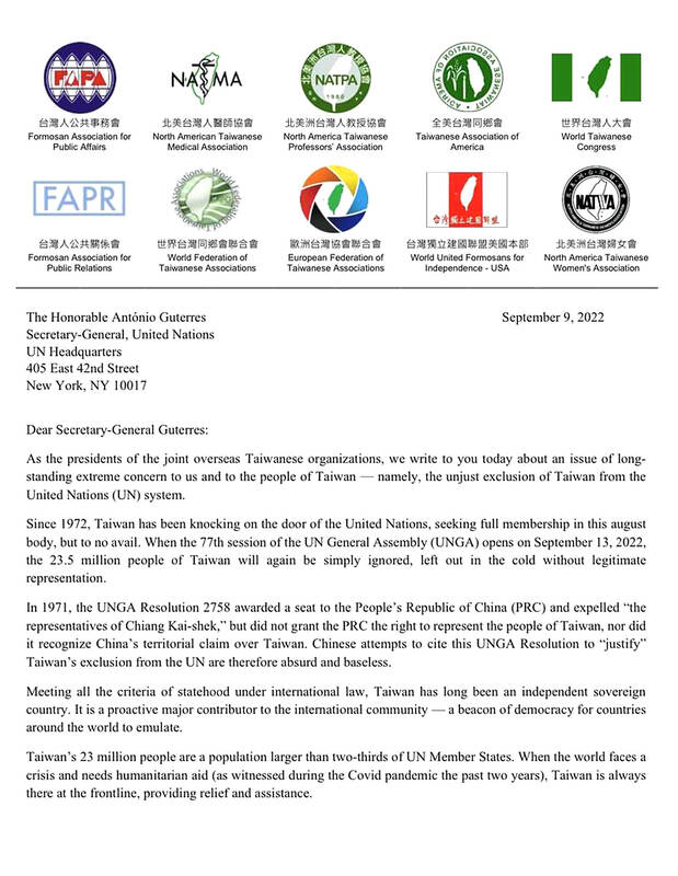 Global organizations representing Taiwanese communities overseas on Friday wrote a letter to UN Secretary-General Antonio Guterres calling for Taiwan’s inclusion in the UN as a full member under that name.