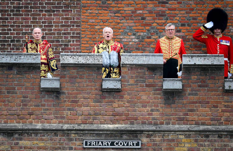 Later, on the Proclamation Gallery, a balcony above Friary Court of St James’ Palace, the Garter King of Arms, David White, accompanied by others in gold and red heraldic outfits, read out the Principal Proclamation, as trumpeters sounded.