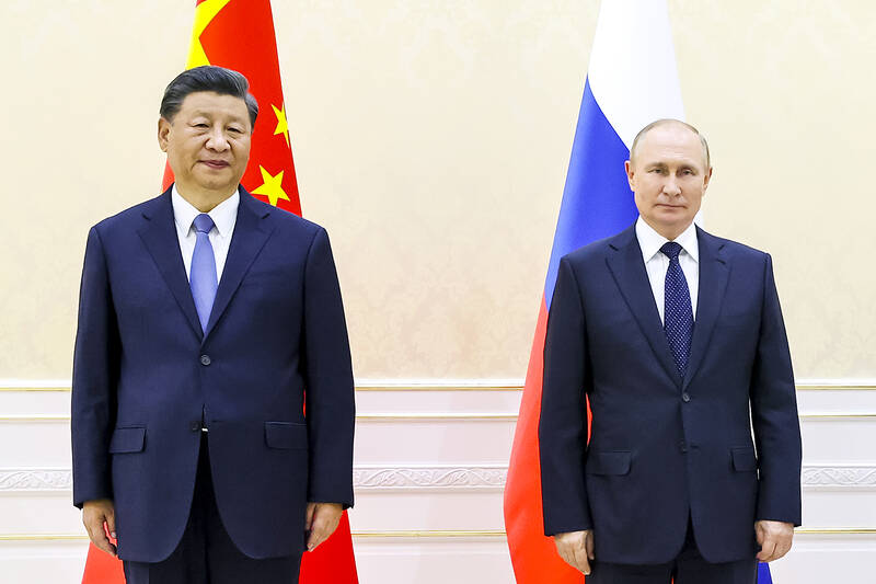Chinese President Xi Jinping, (習近平) Russian President Vladimir Putin and leaders from India and Central Asian nations gathered with other Asian leaders in the ancient Silk Road city of Samarkand yesterday for a summit touted as a challenge to Western global influence.