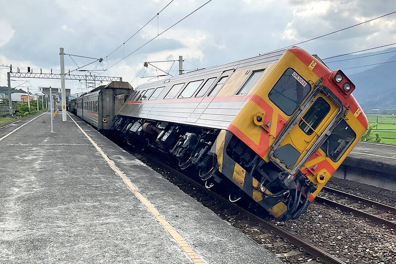 Six cars of Tzuchiang Express train No. 402 derailed in Hualien’s Dongli Station after being hit by a collapsing concrete canopy.