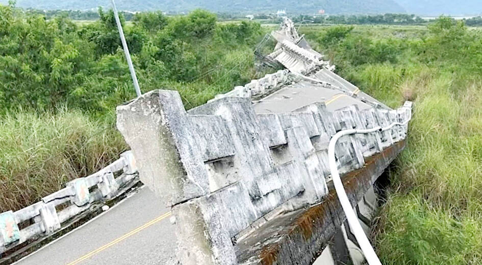 The quake, centered in Taitung County’s Chihshang Township (池上), also caused an apartment building and two bridges in Hualien to collapse. It was the strongest earthquake to hit the nation so far this year and followed a magnitude 6.4 tremor late on Saturday.