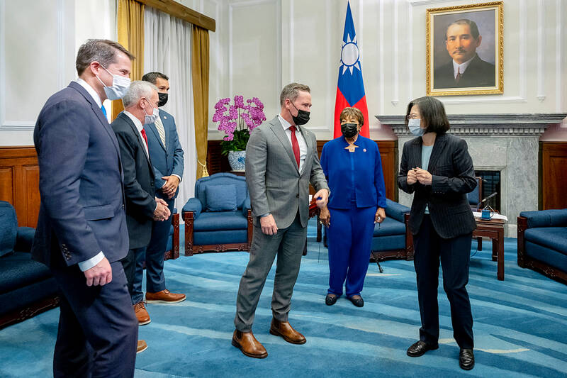 Also joining Johnson in the meeting with Tsai were four other US representatives, who arrived in Taiwan on Tuesday for a three-day visit — Democrats Seth Moulton and Kai Kahele, and Republicans Brad Wenstrup and Michael Waltz.