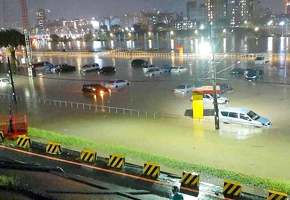 In Taipei, more than 100 vehicles were stuck in floodwater in a parking lot outside floodgates near the Bailing Bridge (百齡橋), and a “yellow” landslide warning was issued in some areas.