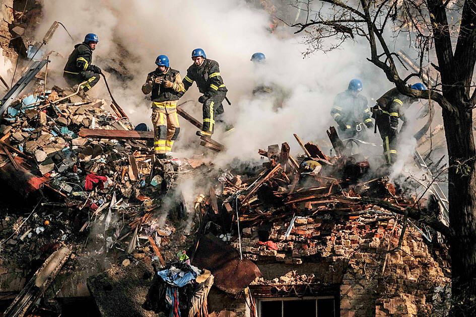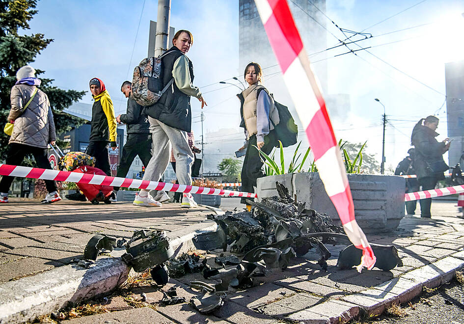 Waves of explosive-laden suicide drones yesterday struck Ukraine’s capital, setting buildings ablaze and tearing a hole in one while sending people scurrying for shelter or attempting to shoot down the kamikazes.