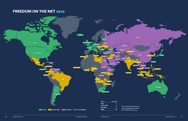 For this year’s report, Freedom House surveyed 70 countries, which account for 89 percent of the world’s Internet users, and it ranked 17 as “free,” including Taiwan and Japan, while 32 were rated as “partly free” and 21 as “not free.”