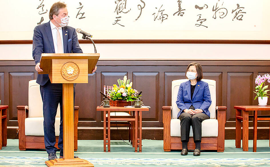 Berlin firmly opposes “changing the cross-strait status quo via means other than peaceful ones and without mutual consent,” Heidt said during a meeting with Tsai in Taipei.