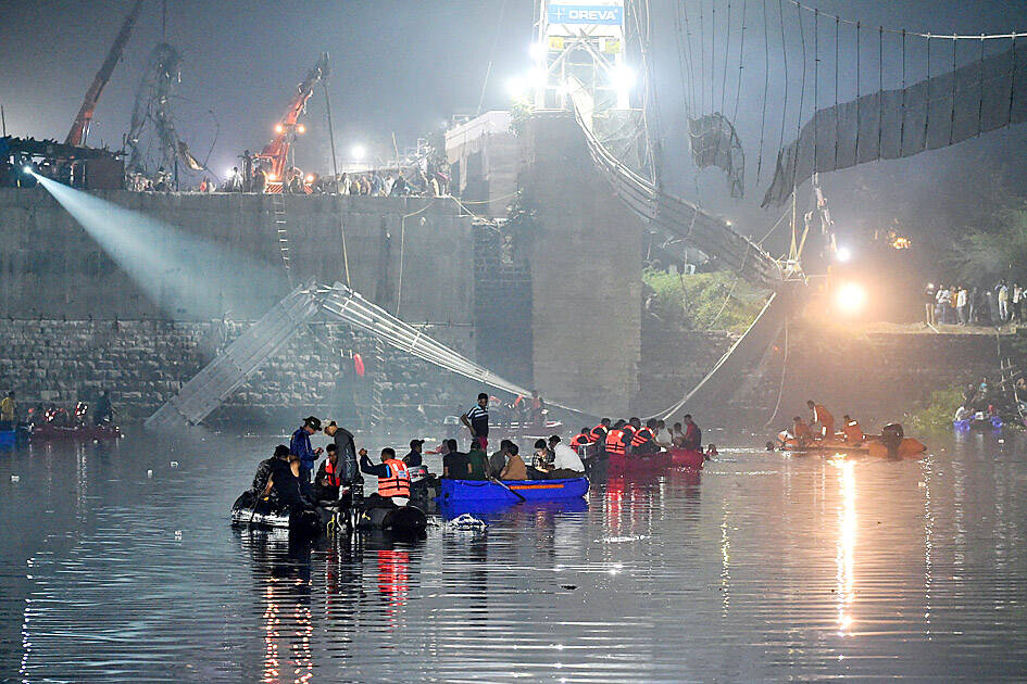 At least 137 people died in western India when a colonial-era pedestrian bridge packed with revelers collapsed into the river below, police said yesterday.