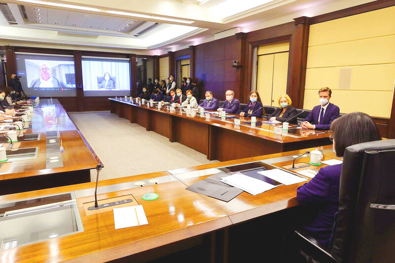 President Tsai Ing-wen (蔡英文) in a meeting with the delegation called for democratic countries to work together in defense of their shared values and emphasized the advantage Taiwan’s semiconductor sector provides in helping reshuffle global supply chains.