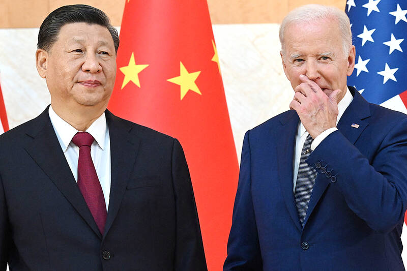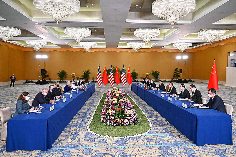 US President Joe Biden yesterday objected to China’s “coercive and increasingly aggressive actions” toward Taiwan, and raised human rights concerns about Beijing’s conduct in Xinjiang, Tibet and Hong Kong during his first in-person meeting with Chinese President Xi Jinping (習近平) since he took office, the White House said.