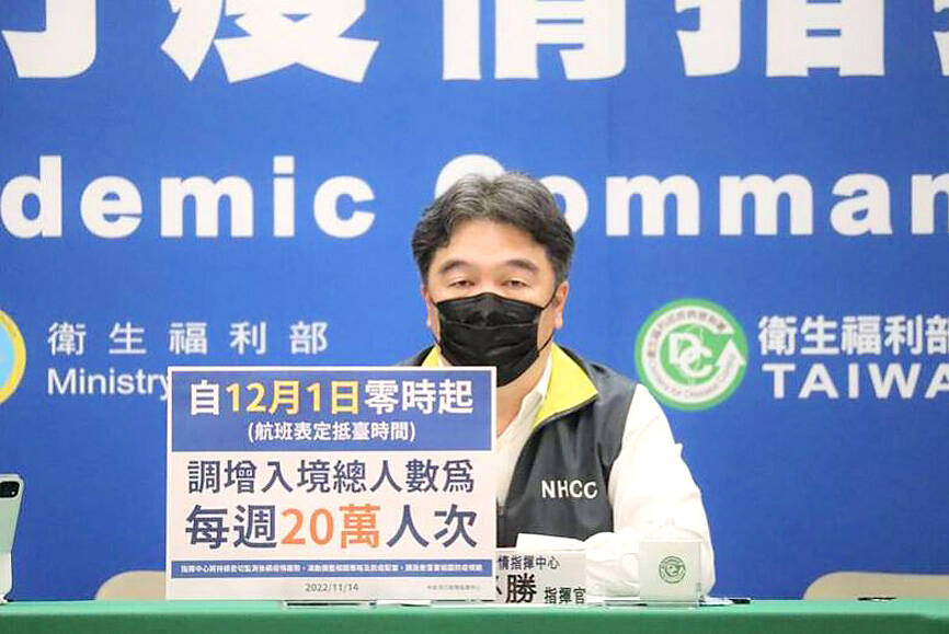 From Dec. 1, the cap on inbound travelers is to be raised to 200,000 people per week, as the number of international arrivals is expected to increase during the winter holidays, the Central Epidemic Command Center (CECC) announced yesterday.