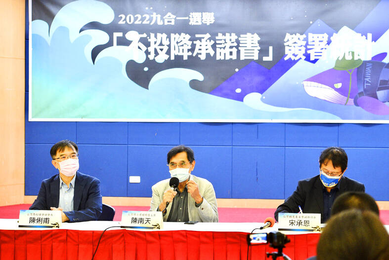 Although the DPP’s mayoral and county commissioner candidates supported the pledge, some of the party’s candidates running for local posts did not sign it, Presbyterian Church in Taiwan representative Lin Wei-lien (林偉聯) said, before asking members of churches represented by his organization to not vote for such candidates.