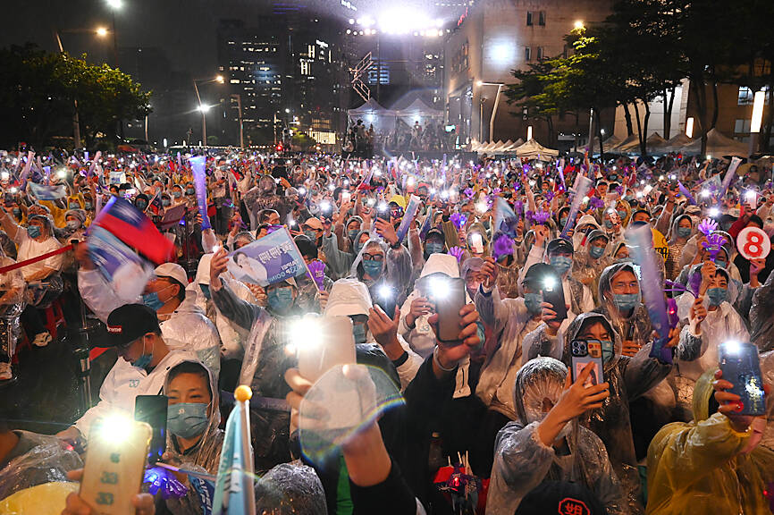 The rain did not dampen the enthusiasm of the crowds, with organizers estimating at least 20,000 at Lin’s event in New Taipei City’s Banciao District (板橋) and about 35,000 at Chen’s rally near DPP headquarters in Taipei.