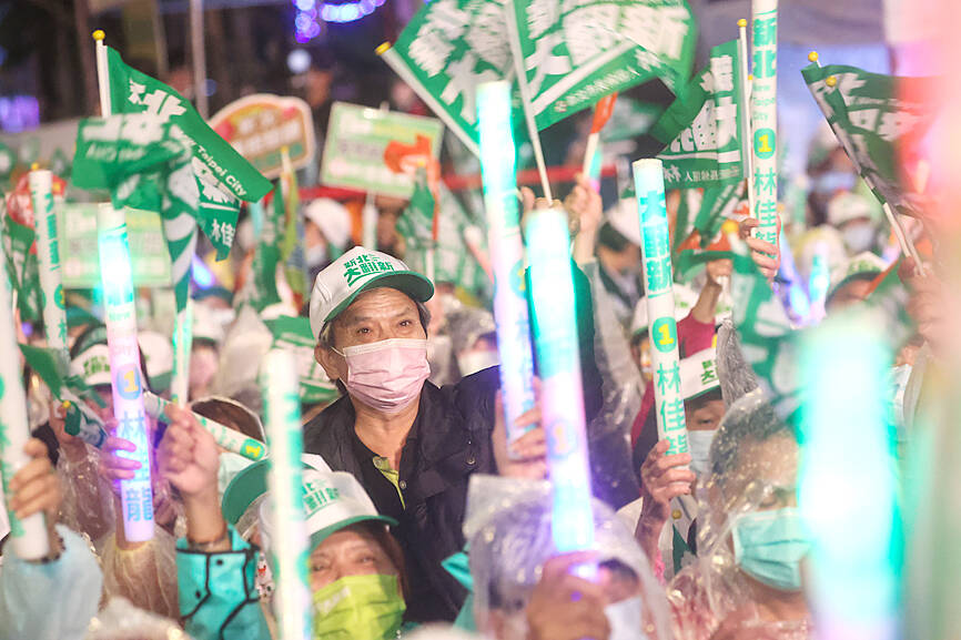 President Tsai Ing-wen (蔡英文) lent her presence on stage to consolidate pan-green camp supporters for party candidates Lin Chia-lung (林佳龍) in New Taipei City and Chen in Taipei.