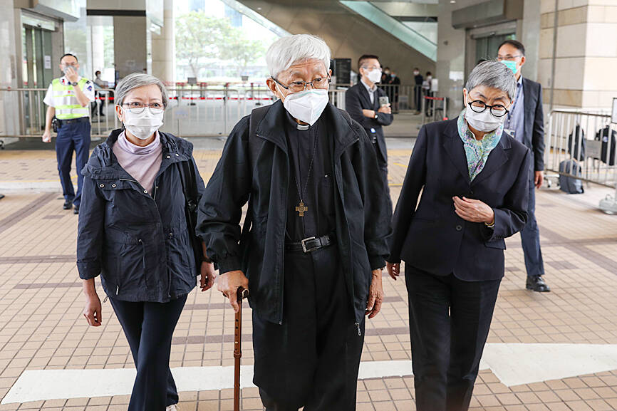 Cardinal Joseph Zen (陳日君), a retired bishop and a vocal Hong Kong democracy advocate, arrived at court in a black outfit and used a walking stick.
