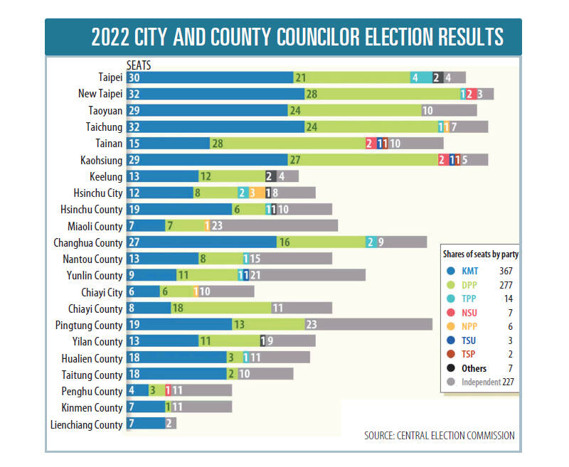 In the six special municipalities, where a total of 377 councilor seats were up for grabs, the Chinese Nationalist Party (KMT) won 167, the Democratic Progressive Party (DPP) took 152, the TPP gained six and the NPP secured one.