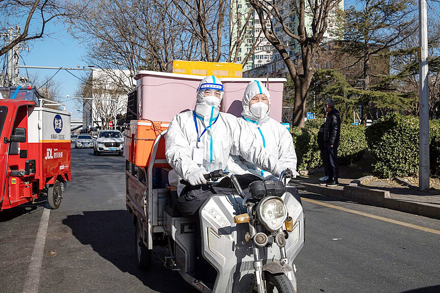 Some Chinese cities yesterday eased some measures to curb the spread of COVID-19 as police patrolled the streets to head off protests while the Chinese Communist Party (CCP) prepared for the high-profile funeral of former Chinese president Jiang Zemin (江澤民).
