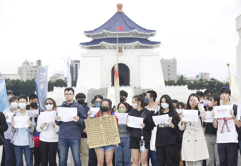 A group of Taiwanese yesterday held blank pieces of paper in Taipei’s Liberty Square in support of protesters in China.