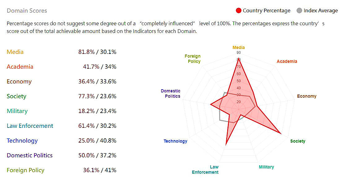 The China Index measures Beijing’s influence on 82 countries and areas around the world, in several domains including academia, domestic politics, economy, foreign policy, law enforcement, media, military, society and technology, Doublethink said on its Web site.