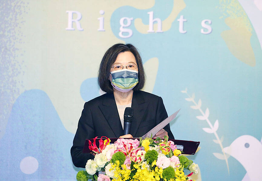 The government is continuing its transitional justice efforts and plans to enhance human rights protection in industrial supply chains, President Tsai Ing-wen (蔡英文) said at a Human Rights Day ceremony yesterday.