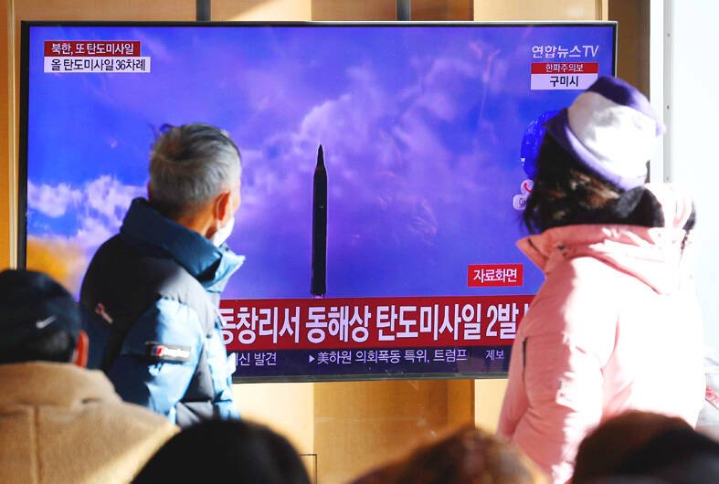North Korea yesterday test-fired a pair of nuclear-capable ballistic missiles with a range of striking Japan, in a possible protest of Tokyo’s adoption of a new security strategy to push for a more offensive footing against North Korea and China.