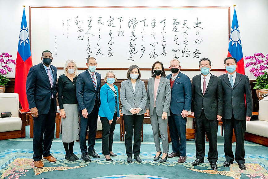 The 13-member delegation also met with Premier Su Tseng-chang (蘇貞昌) and other senior officials from the National Development Council, the Ministry of Economic Affairs, the Office of Trade Negotiations and the Ministry of Foreign Affairs during their stay, which began Sunday and ends today.
