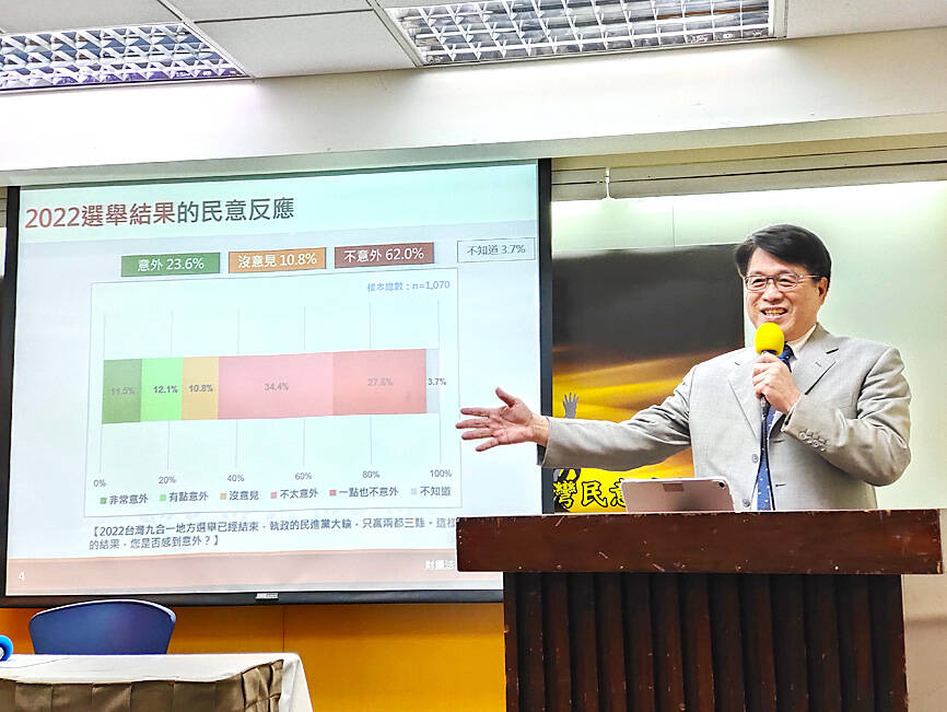 Regarding political figures, 64.2 percent of respondents said they view New Taipei City Mayor Hou You-yi (侯友宜) of the KMT in a favorable light, 20.7 percent were ambivalent, 8.1 percent disliked him and 6.9 percent said they did not know.