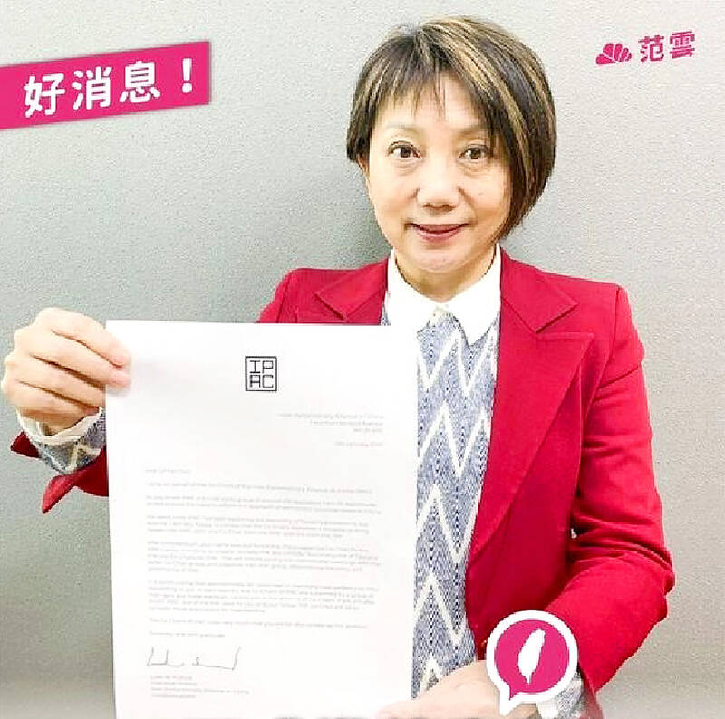 Fan said she is glad to know that 40 legislators in Taiwan have applied for IPAC membership, adding that once she begins her duties as cochair, she plans to assist like-minded legislators in obtaining membership.