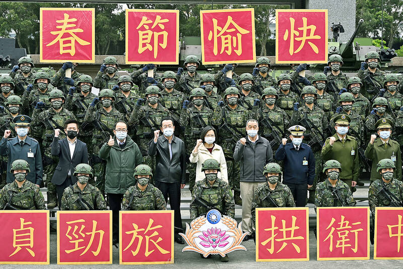 President Tsai Ing-wen (蔡英文) yesterday visited the military police’s Mechanized Infantry 239th Battalion, thanking troops for remaining on duty during the Lunar New Year holiday while encouraging them to boost the public’s confidence in the military’s combat readiness.