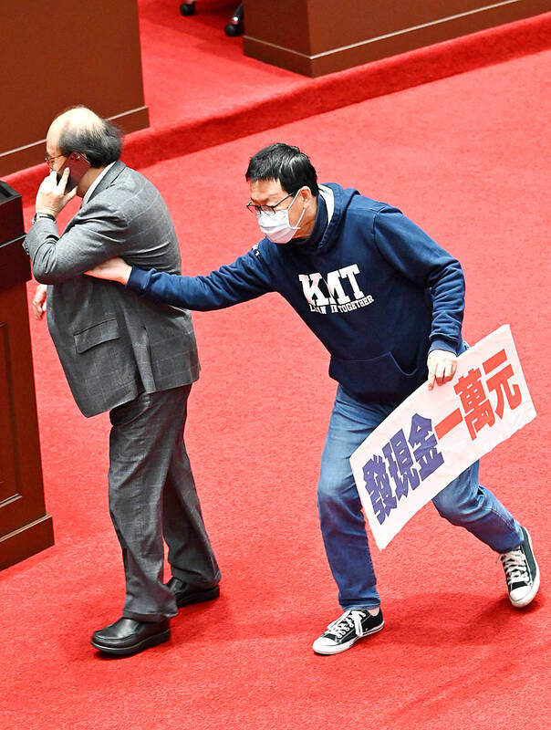 A motion tendered by the Chinese Nationalist Party (KMT) caucus to issue NT$10,000 cash handouts instead of NT$6,000 was rejected by Democratic Progressive Party (DPP) lawmakers during the all-member hearing.