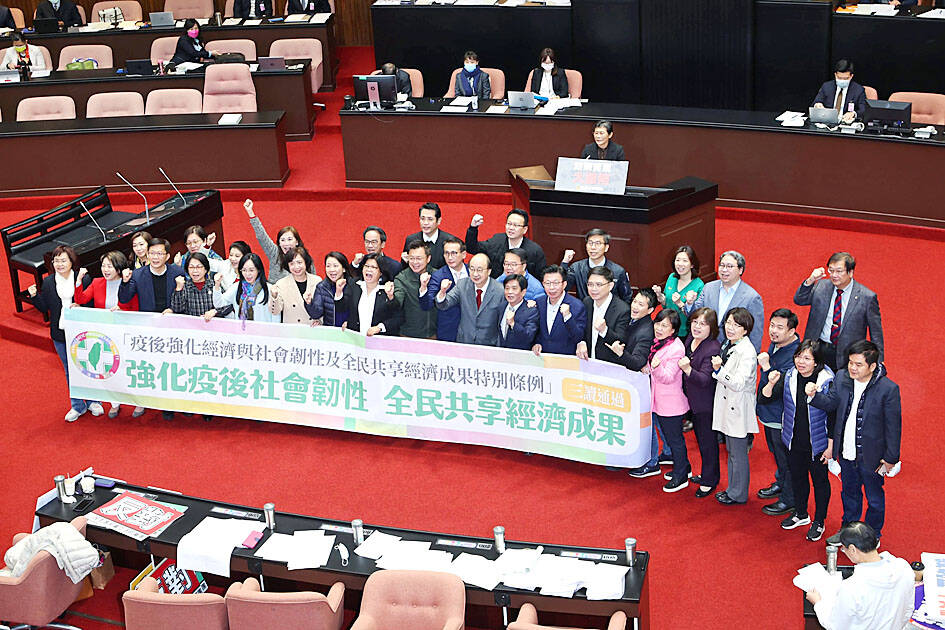 The legislature yesterday passed a special bill to allocate NT$380 billion (US$12.49 billion) from last year’s surplus tax revenue to help Taiwan recover from the COVID-19 pandemic, which includes a provision to issue NT$6,000 cash handouts to all Taiwanese and tax-paying permanent residents.
