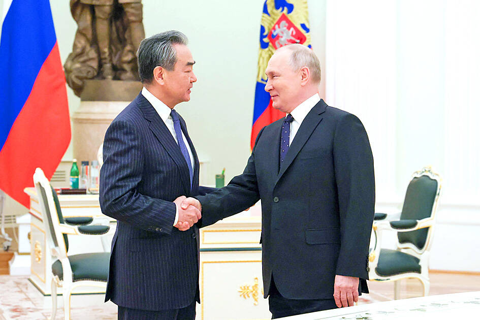On Wednesday, Russian President Vladimir Putin hosted the Chinese Communist Party’s most senior foreign policy official — Wang Yi (王毅) — raising concern in the West that Beijing might be ready to offer Moscow stronger support in the year-old war.