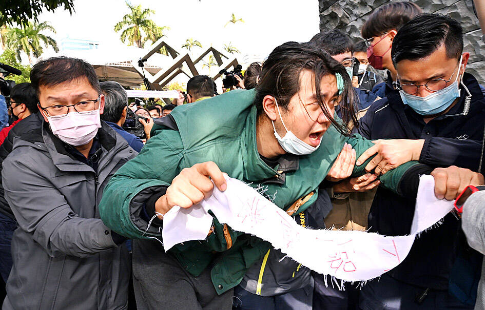 As Chiang Wan-an began his speech, protesters holding banners ran toward him from behind. Security quickly intervened and Chiang Wan-an continued his speech.