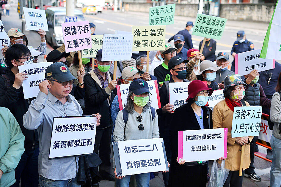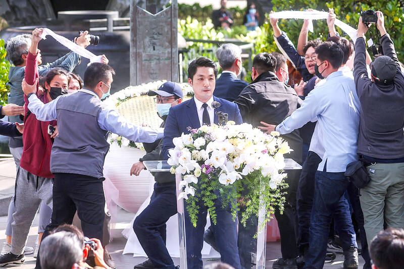 At the Taipei City Government’s annual memorial ceremony at 228 Peace Memorial Park yesterday afternoon, more than a dozen protesters interrupted Taipei Mayor Chiang Wan-an’s (蔣萬安) speech, calling him a murderer and demanding that he “kneel down and apologize.”