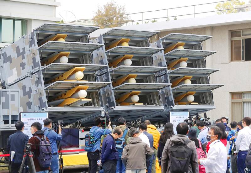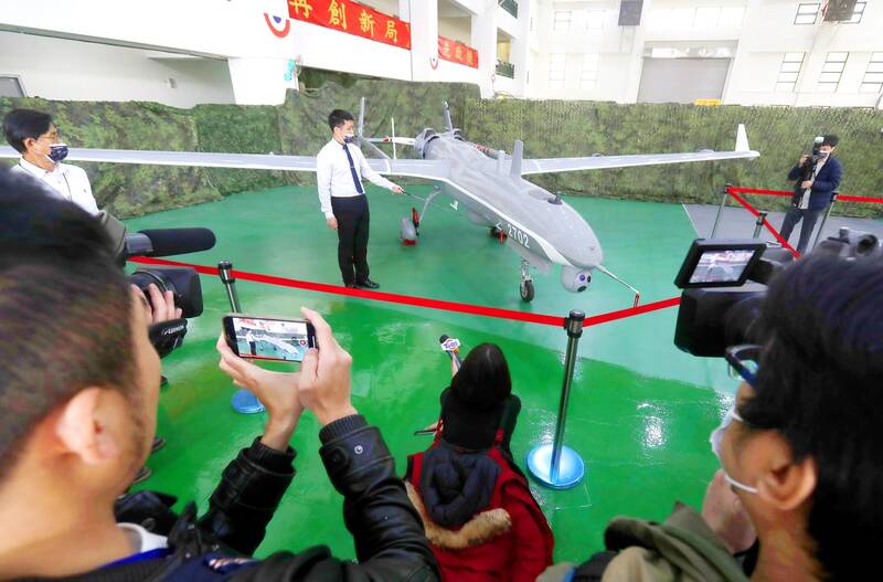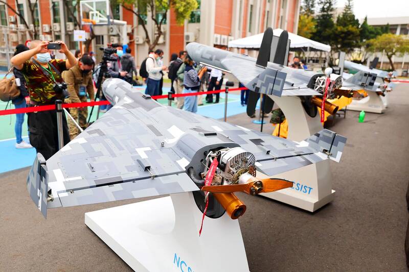 Taiwan’s top military research body yesterday unveiled nine domestically developed drones in Taichung, including a loitering munition, or “suicide drone,” similar to the US-made AeroVironment Switchblade 300.