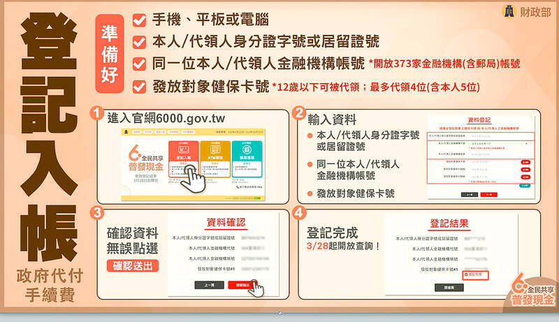 Registration via 6000.gov.tw would be open from 8am on Wednesday, the ministry said, adding that the rebates would be wired to peoples’ bank accounts.