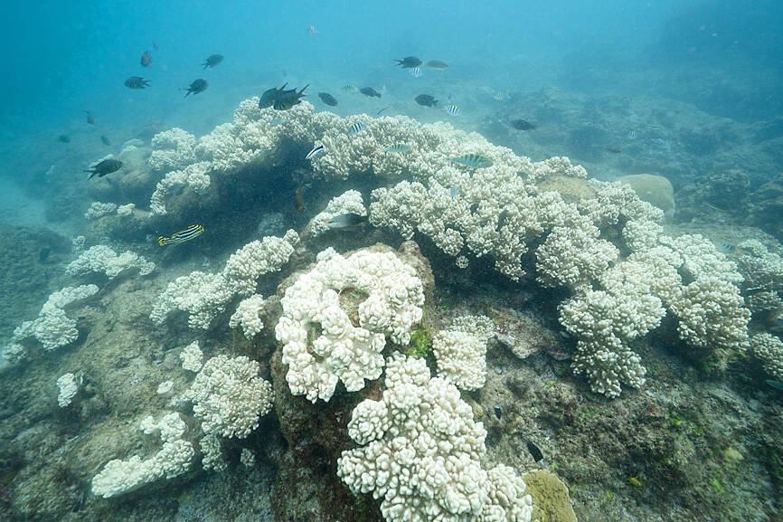 Scientists are looking at ways to stave off bleaching by studying high-temperature-resistant corals, but this would not solve the problem of hypoxia, said Chen Chao-lun (陳昭倫), an associate researcher at Academia Sinica’s Biodiversity Research Center.