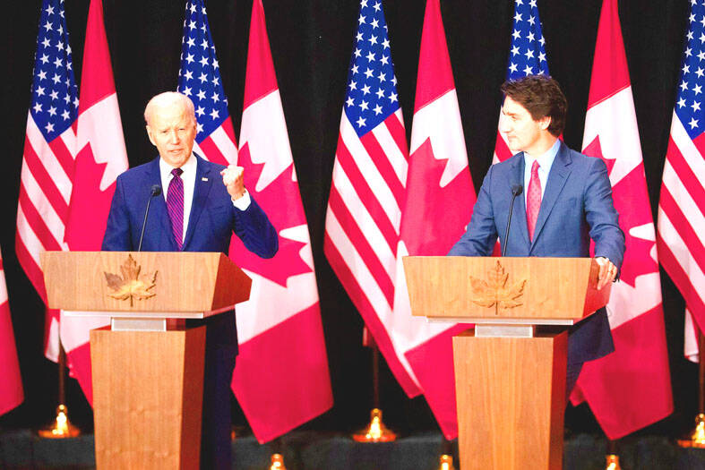 Images of Biden and Trudeau standing side by side in Ottawa announcing agreements including on semiconductors and migration represented a counterpoint to the scene in Moscow days earlier. There, Chinese President Xi Jinping (習近平) and Russian President Vladimir Putin professed friendship and pledged closer ties as Russia struggles to make gains in what the West considers an unjust invasion of Ukraine.