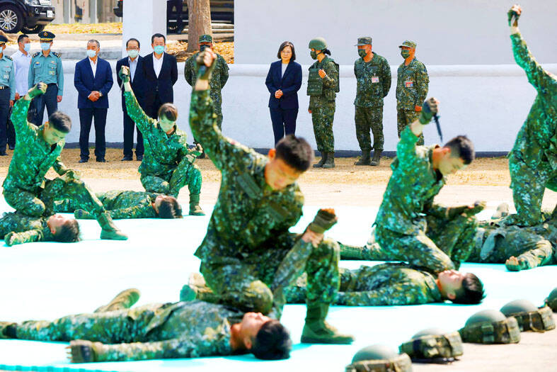 “Protecting Taiwan and defending democracy has always been our military’s great mission,” she told the soldiers, accompanied by Minister of National Defense Chiu Kuo-cheng (邱國正) and National Security Council Secretary-General Wellington Koo (顧立雄).
