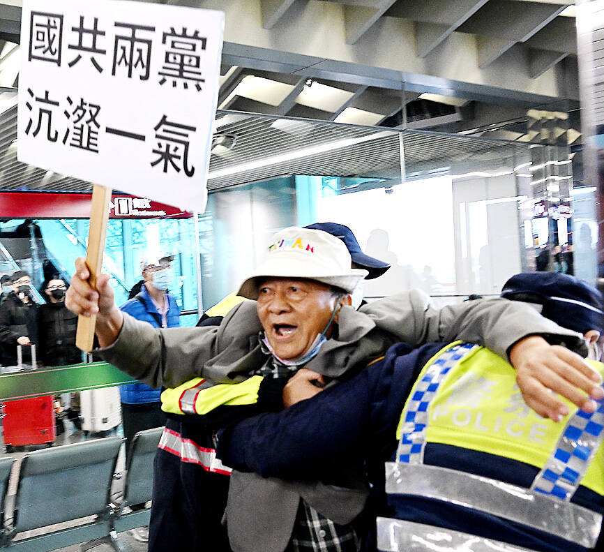 Taiwan Republic Office director Chilly Chen (陳峻涵) led a protest against Ma and his delegation at the airport yesterday, as they accused the former president of kowtowing to Beijing and selling out Taiwan.