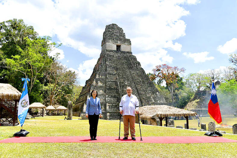 Accompanied by Giammattei and Guatemalan Minister of Foreign Affairs Mario Bucaro, Tsai watched a Mayan ball game and an invocation ceremony, and the two presidents exchanged gifts, in front of the Temple of Ah Cacao, a limestone pyramid that dates back to about 732 AD and is the tomb of a ruler of that era.