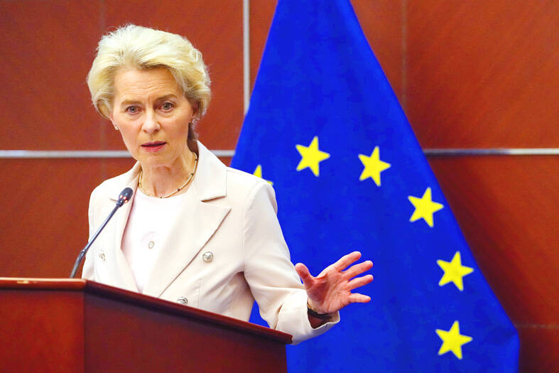 Using force to change the “status quo” across the Taiwan Strait would be “unacceptable,” European Commission President Ursula von der Leyen told Chinese President Xi Jinping (習近平) at a meeting in Beijing on Thursday.