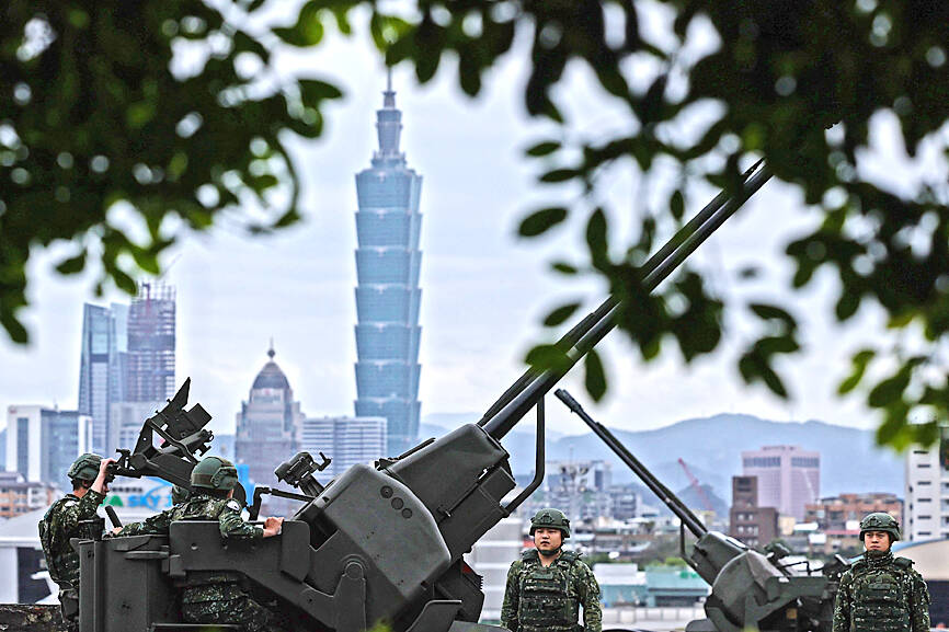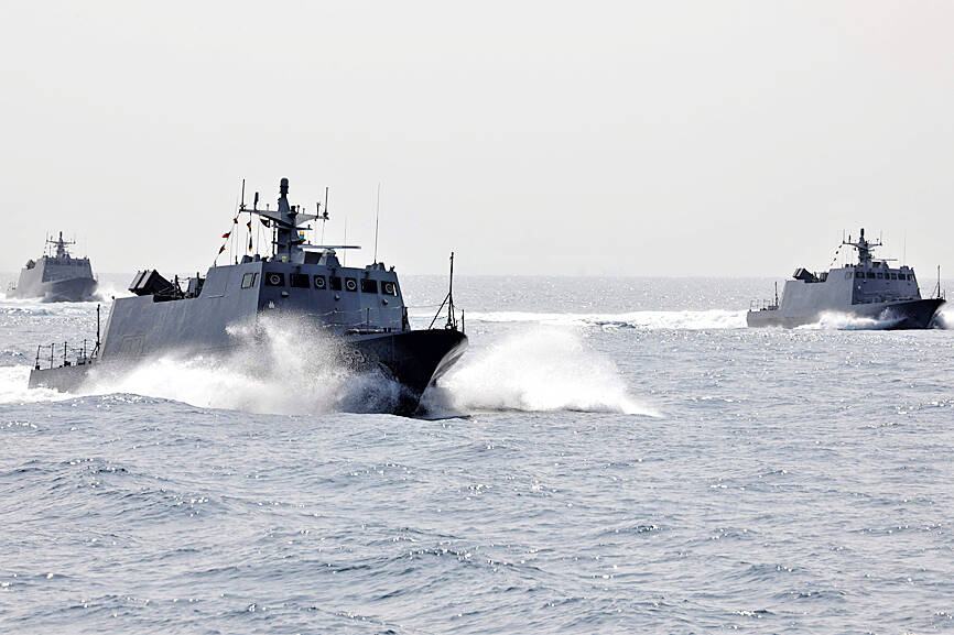 Separately yesterday, the Ministry of National Defense also released pictures of mobile launchers for Taiwan-made Hsiung Feng anti-ship missiles at an undisclosed location, as well as missile-armed fast attack boats at sea.