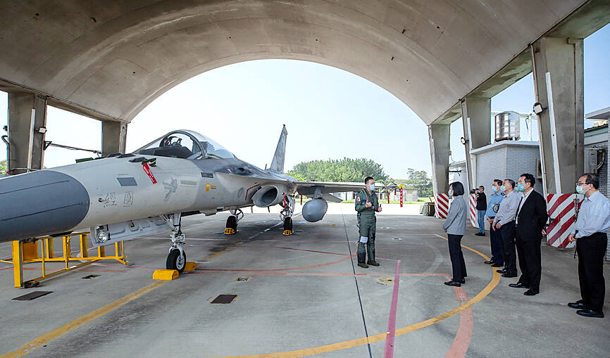 During a meeting in Taichung with pilots who are frequently stationed at a frontline air base in Penghu County’s Magong City (馬公), Tsai thanked them for their hard work and for sticking to their posts at all times.