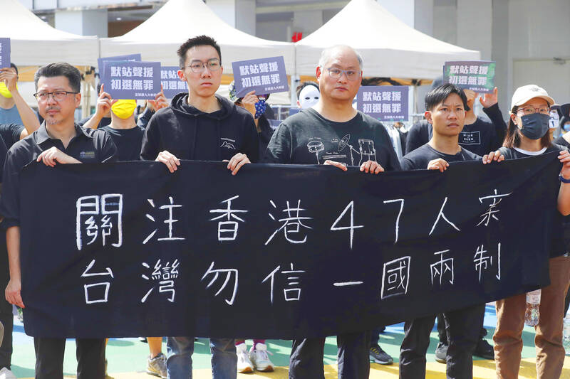 Hong Kongers living in Taiwan and local supporters hold slogans reading “Follow the case of 47 democracy activists in Hong Kong. Taiwan does not believe in one country, two systems” during a silent protest in Taipei yesterday in solidarity with dissidents in Hong Kong.