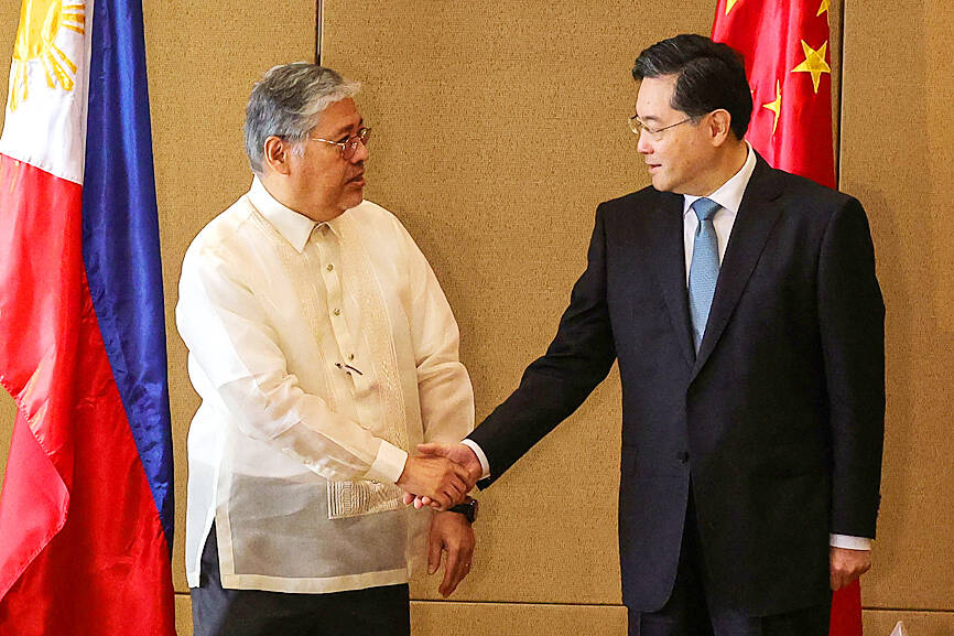 The Philippines’ top diplomat has expressed his concern to Chinese Minister of Foreign Affairs Qin Gang (秦剛) over escalating tensions in waters around Taiwan, Manila said yesterday.