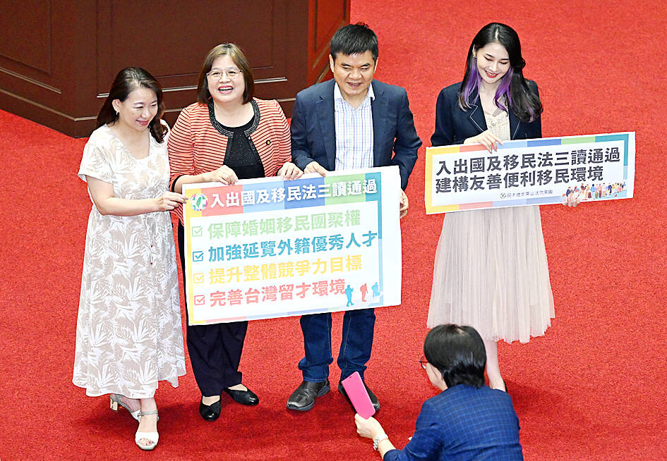 Foreigners who are highly skilled professionals, top-prize winners in professional disciplines, investment immigration applicants or have made special contributions to Taiwan can soon apply for permanent residency on behalf of their spouses and minor or disabled children after the legislature approved amendments to the Immigration Act (入出國及移民法).