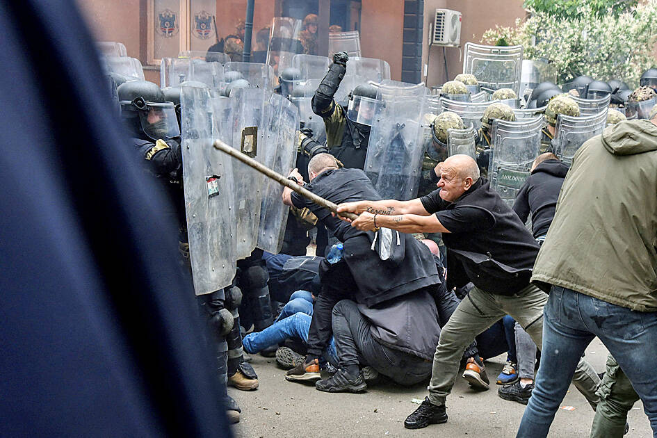 Dozens of NATO troops yesterday secured a municipal building in the Kosovo town of Zvecan, a day after 30 NATO soldiers and 52 Serb protesters were injured in clashes that EU and NATO officials said were unacceptable as they urged calm.